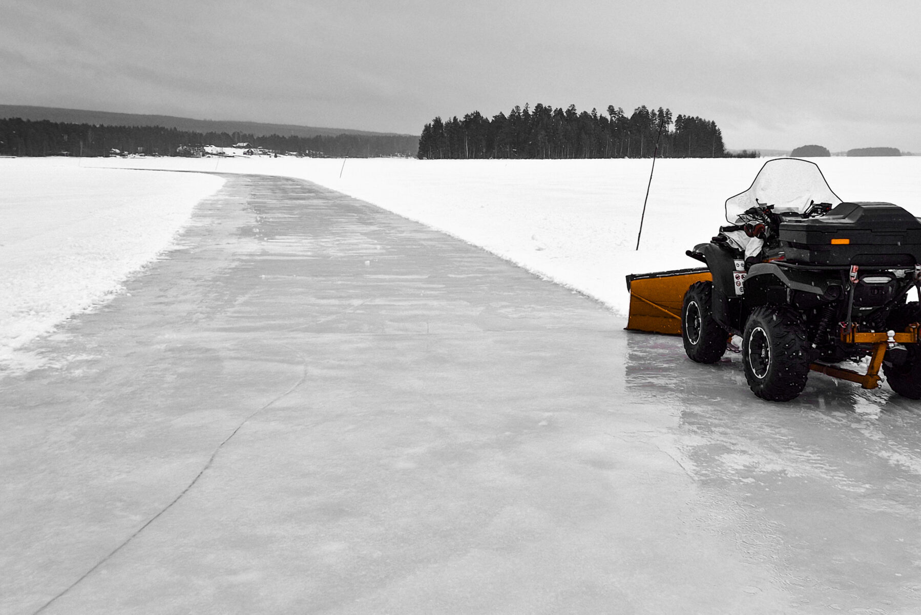 (Sladdad = vi drar en kraftig gummiraka efter fordonet som pressar bort det tunna snölagret mot kanterna. Isen blir renare men det krävs en slät is vilket inte finns på Saxviken).